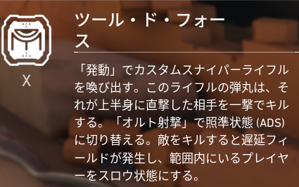 主に、攻めではキルジョイのように裏取りの警戒、守りでは仲間が見ていない場所の情報を取る。