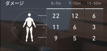 30~50mまでは頭66、胴22、足18ダメージとなっています。