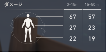 0~15mまでは頭67、胴体27、足22ダメージとなっています。
